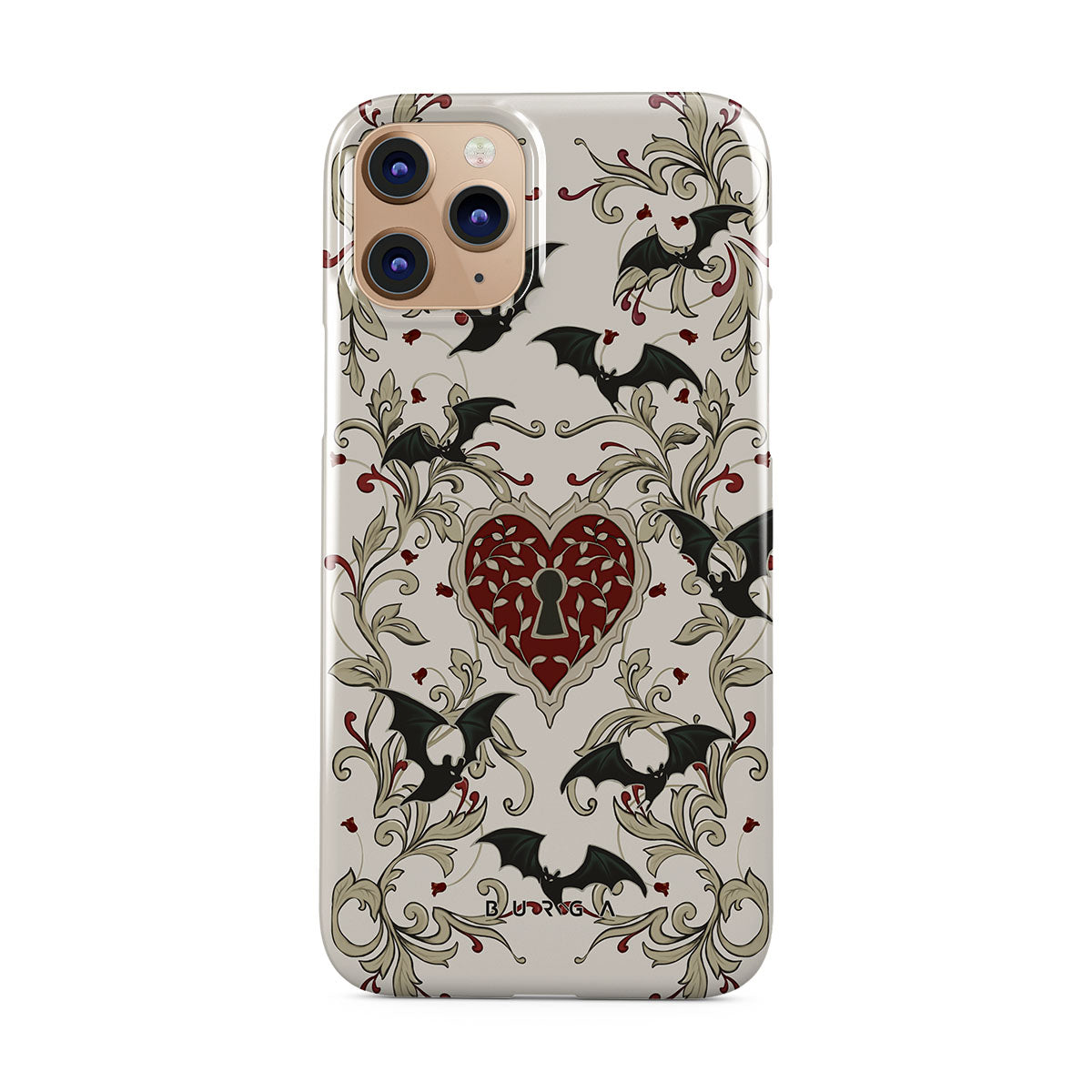 此設計特色:心形、鎖頭、蝙蝠、哥特風格圖案