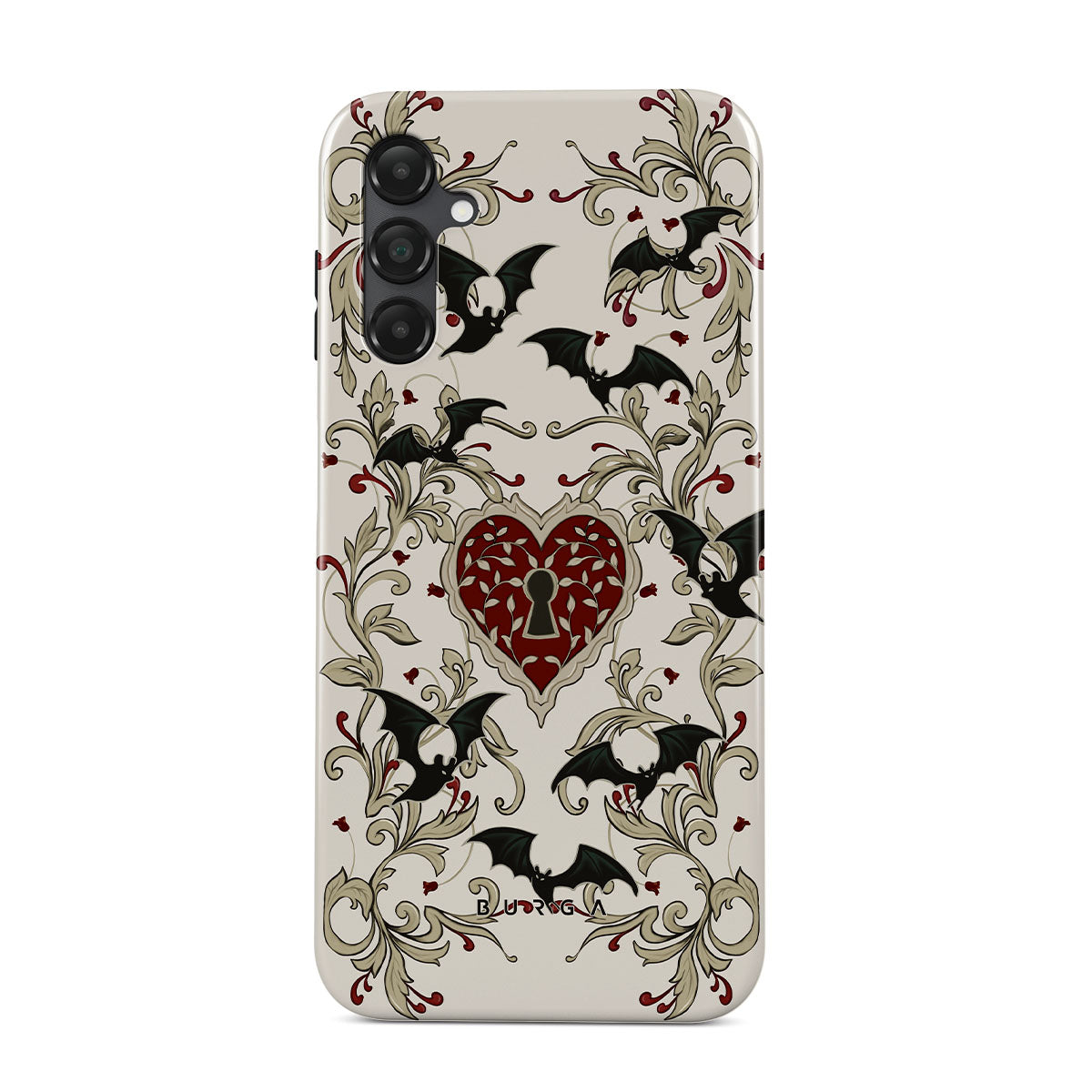 此設計特色:心形、鎖頭、蝙蝠、哥特風格圖案