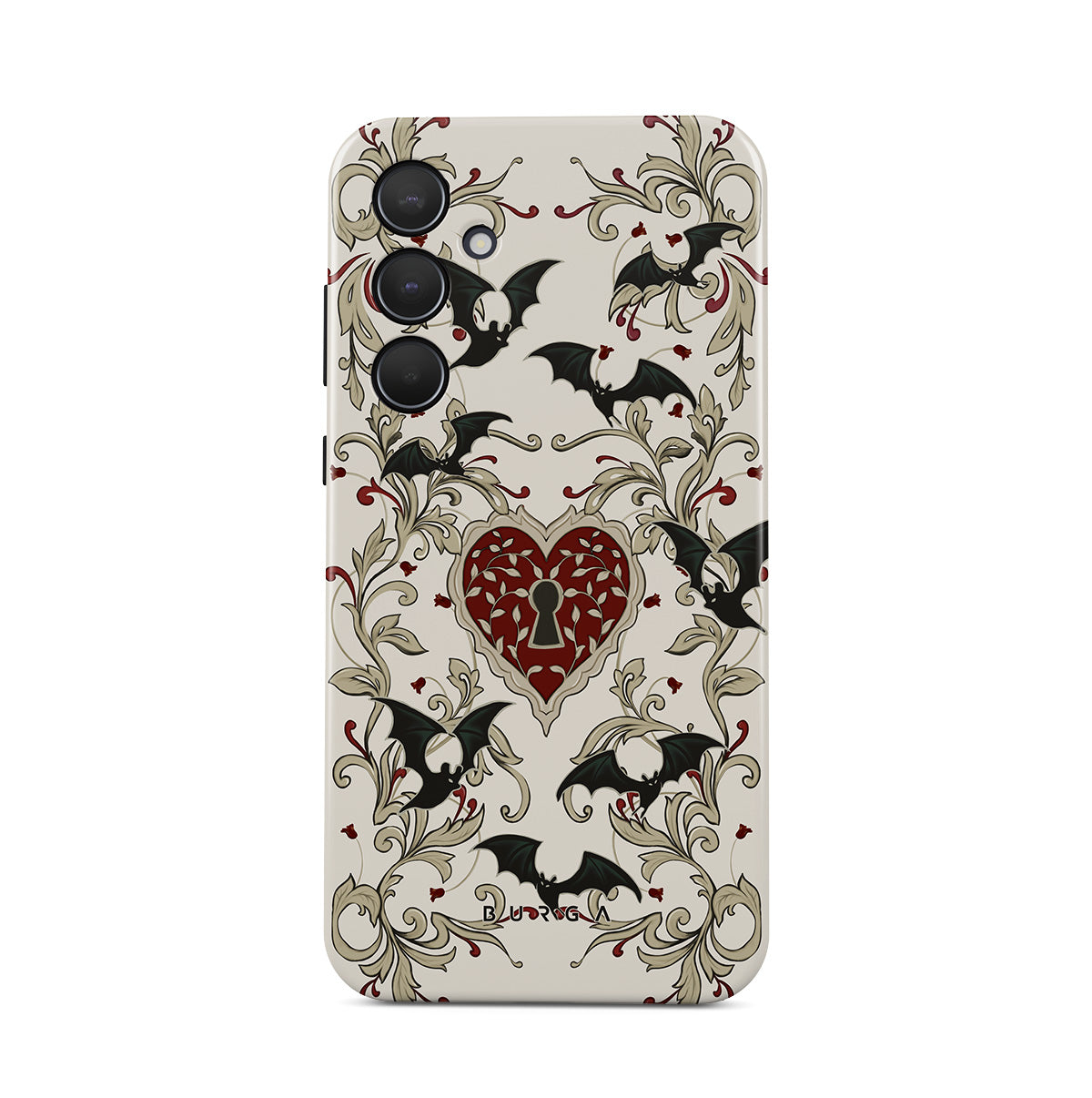 此設計特色:心形、鎖頭、蝙蝠、哥特風格圖案