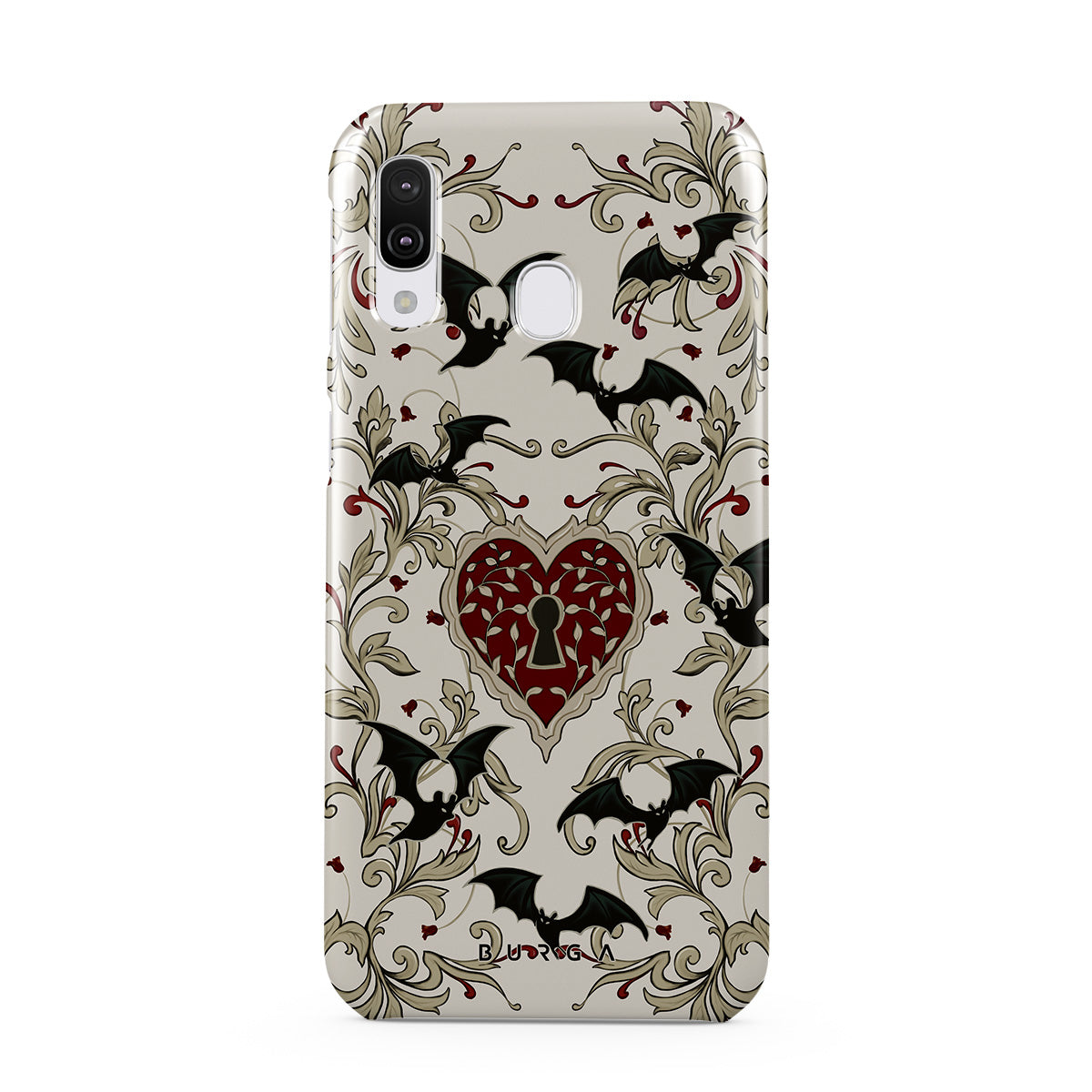 此設計特色:心形、鎖頭、蝙蝠、哥特風格圖案