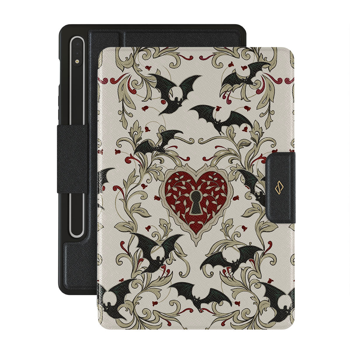 此設計特色:心形、鎖頭、蝙蝠、哥特風格圖案