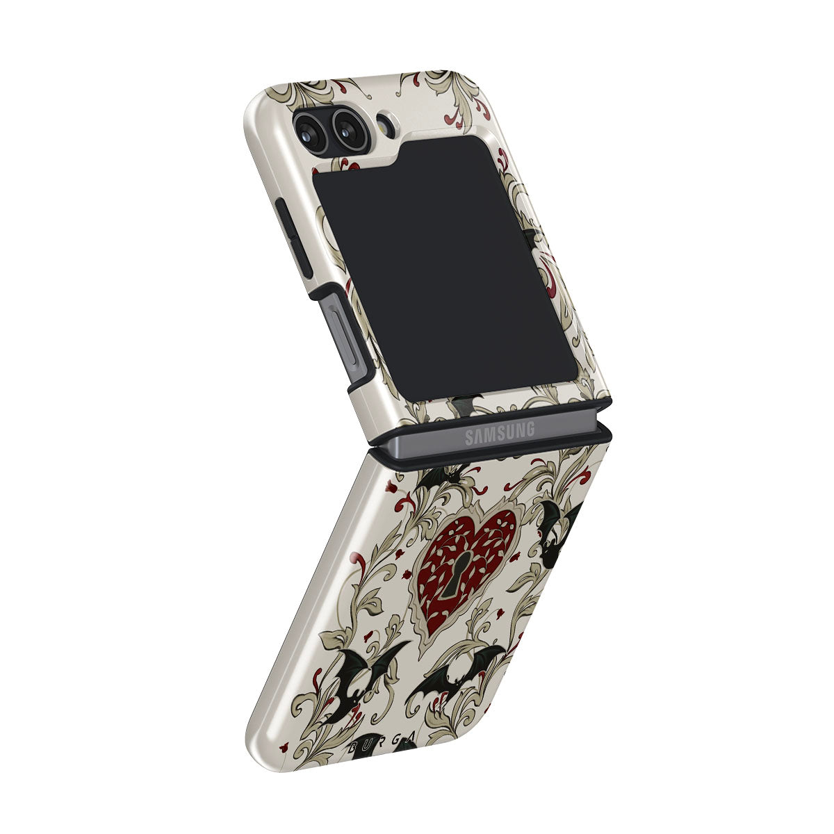 此設計特色:心形、鎖頭、蝙蝠、哥特風格圖案