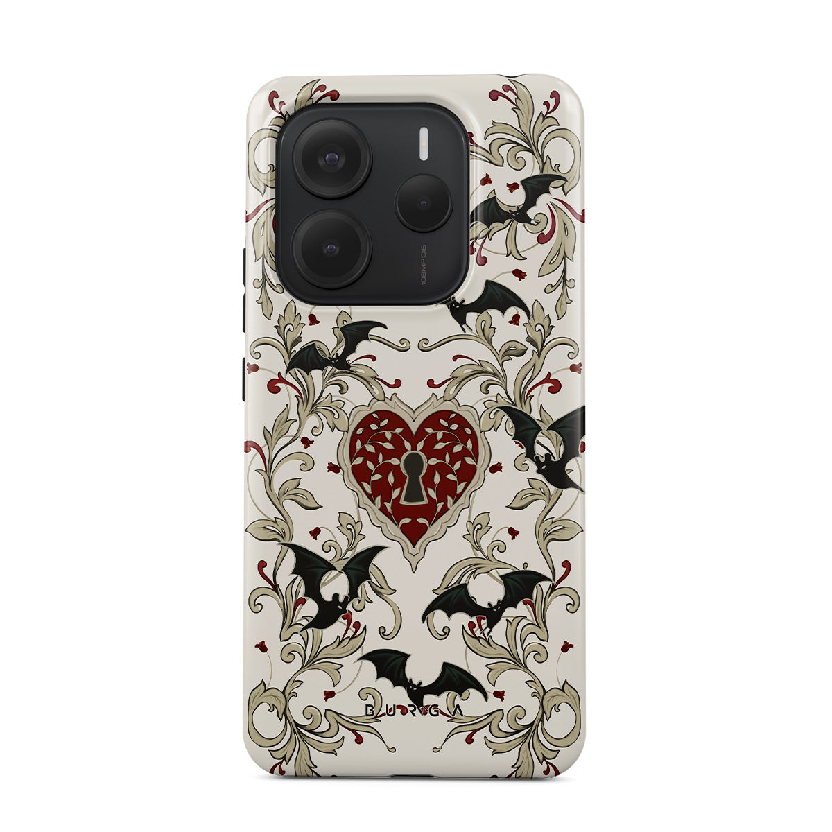 此設計特色:心形、鎖頭、蝙蝠、哥特風格圖案