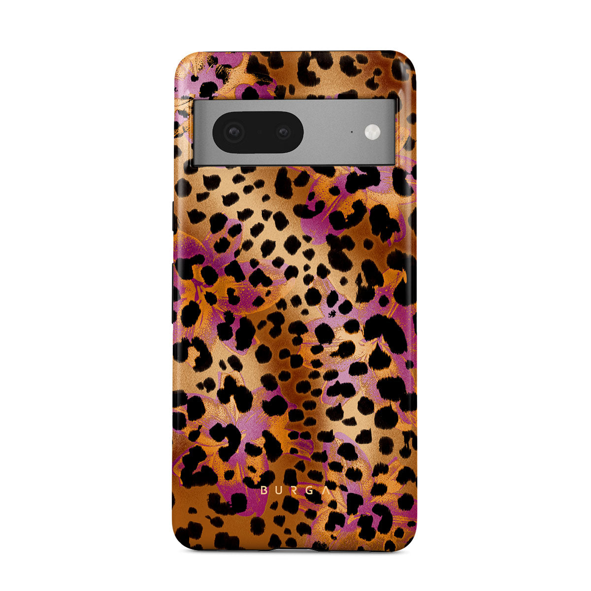 此設計特色:豹子印花,棕色,橙色,紫色,動物印花
