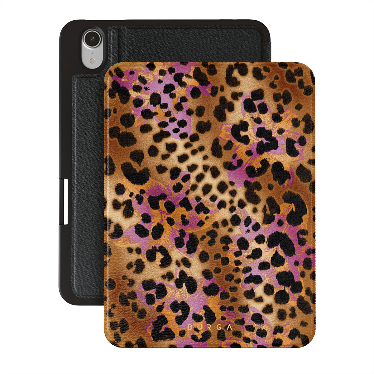 此設計特色:豹子印花,棕色,橙色,紫色,動物印花