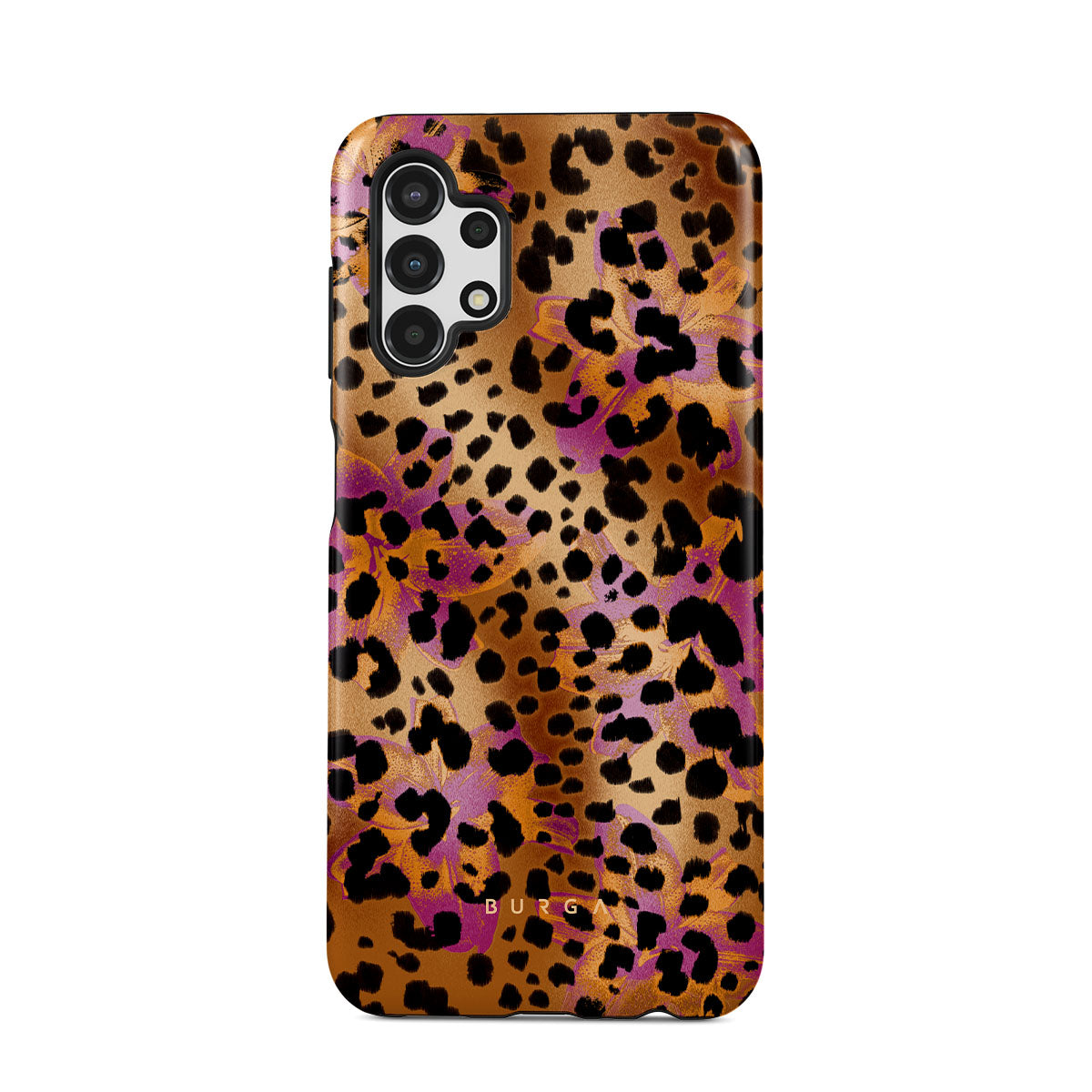 此設計特色:豹子印花,棕色,橙色,紫色,動物印花