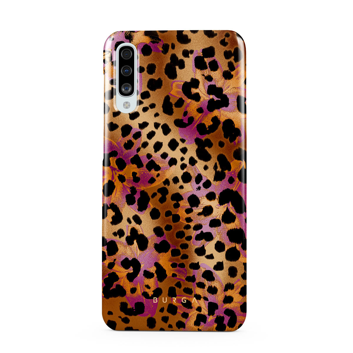 此設計特色:豹子印花,棕色,橙色,紫色,動物印花
