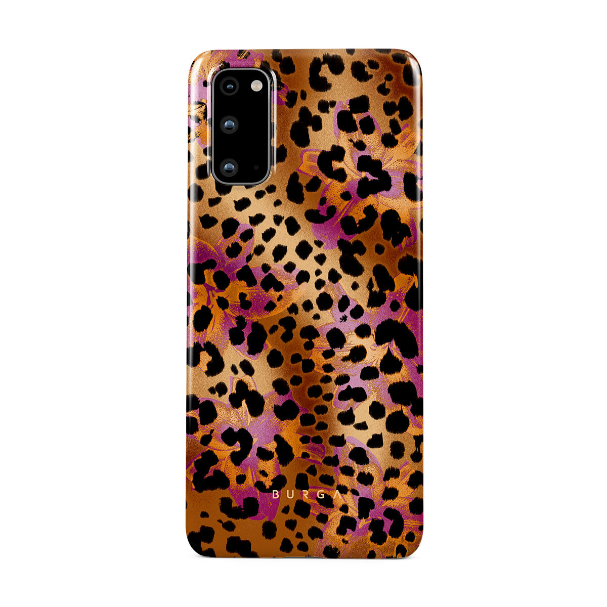 此設計特色:豹子印花,棕色,橙色,紫色,動物印花