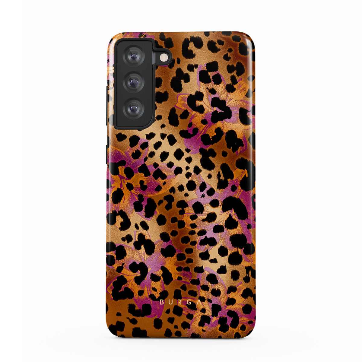 此設計特色:豹子印花,棕色,橙色,紫色,動物印花