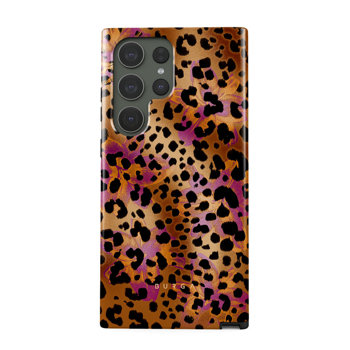 此設計特色:豹子印花,棕色,橙色,紫色,動物印花