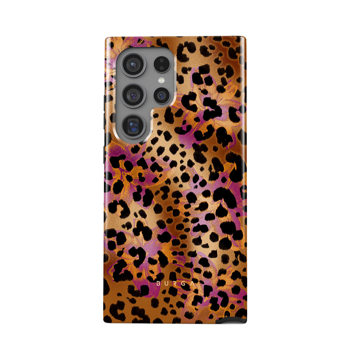 此設計特色:豹子印花,棕色,橙色,紫色,動物印花