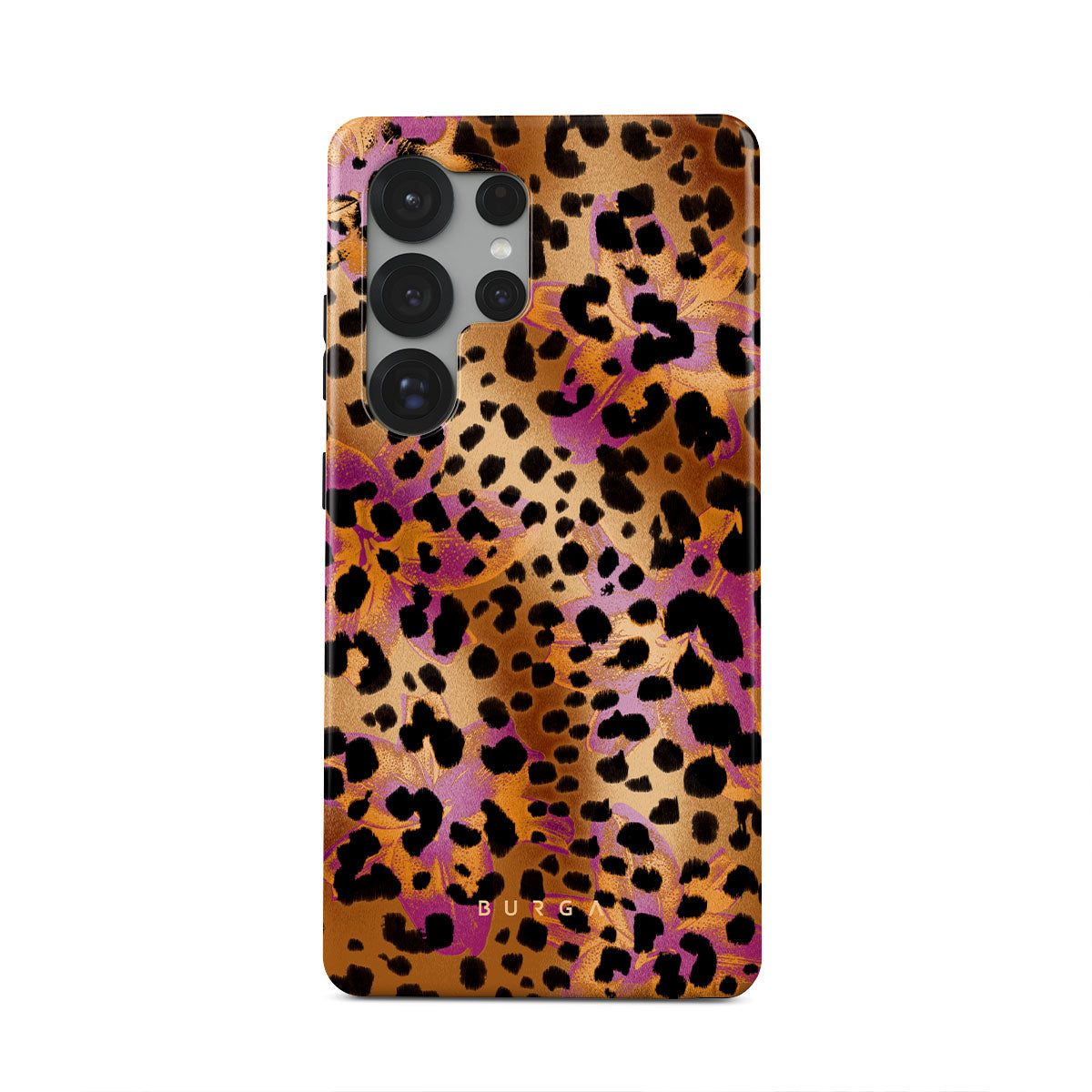此設計特色:豹子印花,棕色,橙色,紫色,動物印花