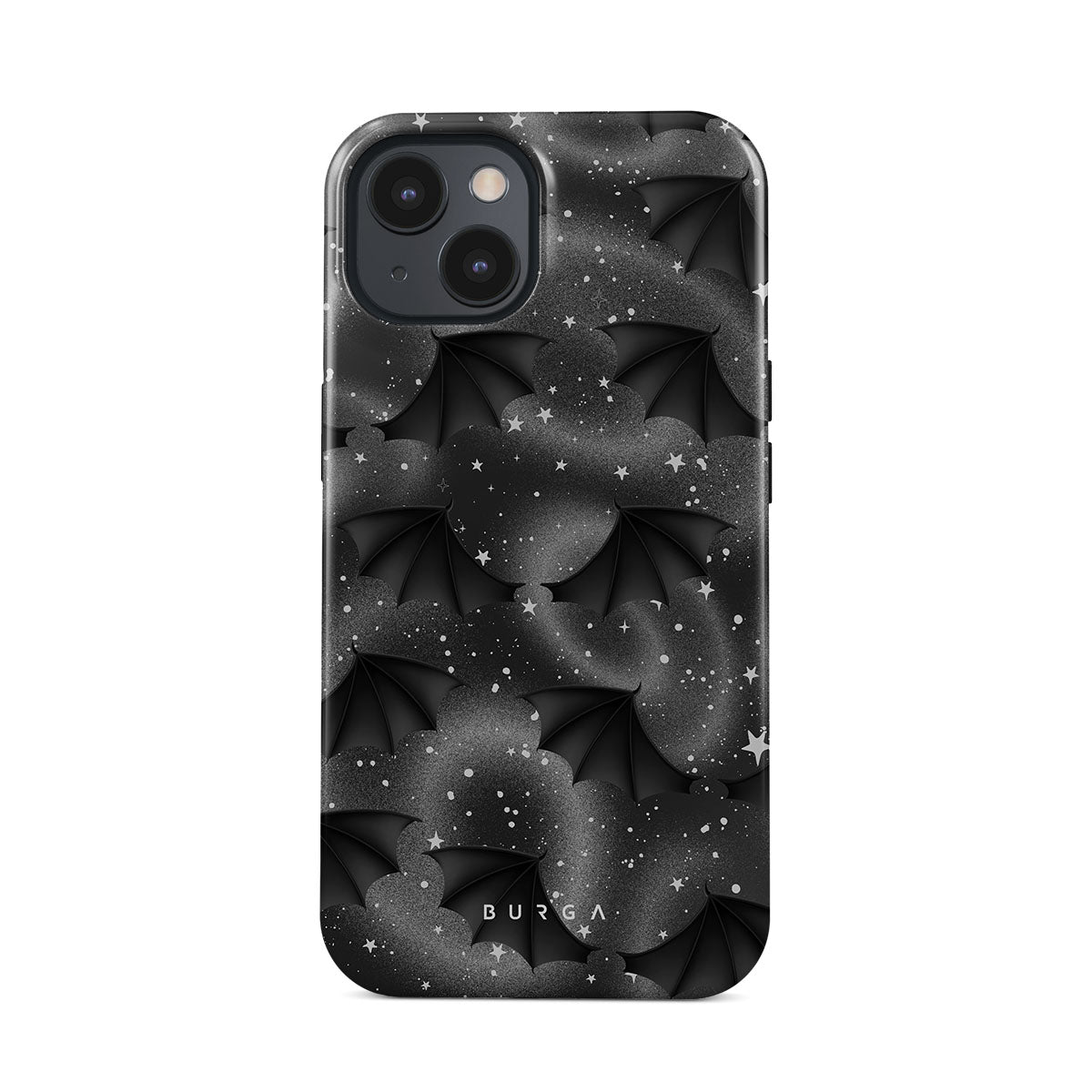 此設計特色:蝙蝠翅膀、星星、神秘漩渦、黑色天空