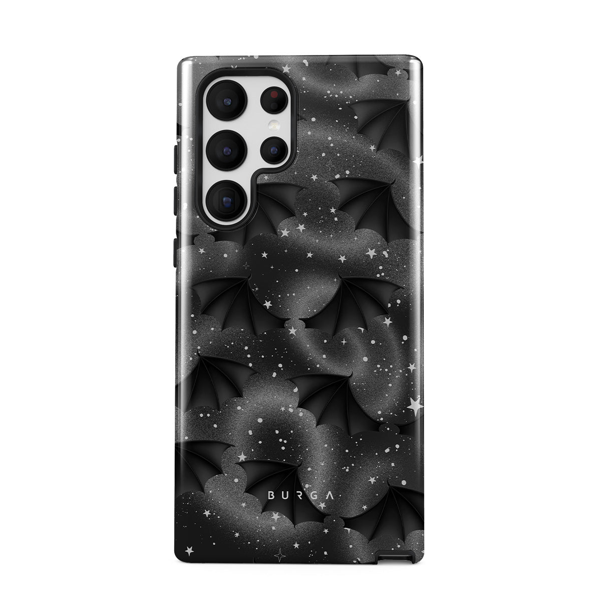 此設計特色:蝙蝠翅膀、星星、神秘漩渦、黑色天空